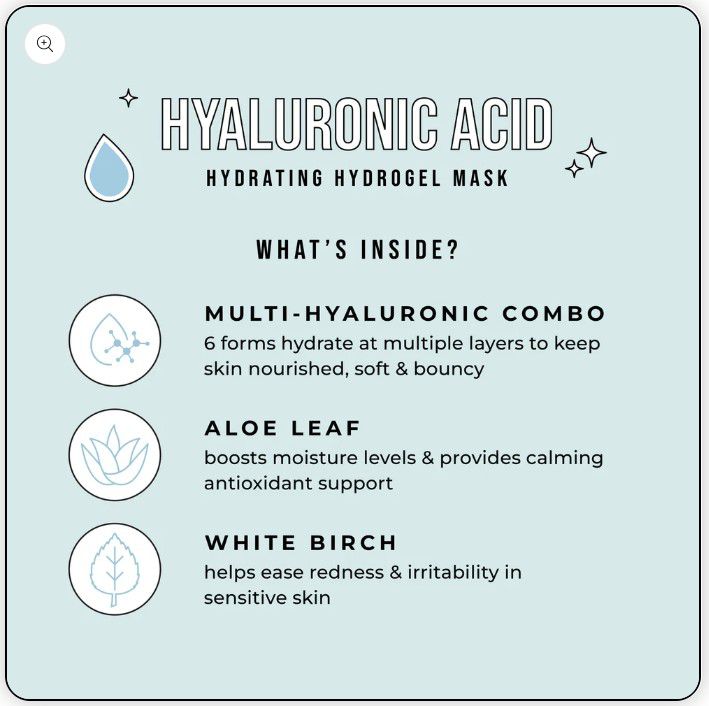 水/水/水,甘油,1,2-己二醇,瓊脂,玻尿酸鈉,玻尿酸,水解玻尿酸,庫拉索蘆薈葉萃取物,白樺葉萃取物,蔗糖,尿囊素,甜菜鹼,乙基己基甘油,甘草酸二鉀,左旋糖,羥丙基三甲基氯化銨透明質酸,辛甘醇,乙醯化透明質酸鈉,透明質酸鈉交聯聚合物,水解透明質酸鈉,透明質酸鉀,丁二醇,黃原膠,角豆膠,皺波角叉菜,群青(CI 77007)。