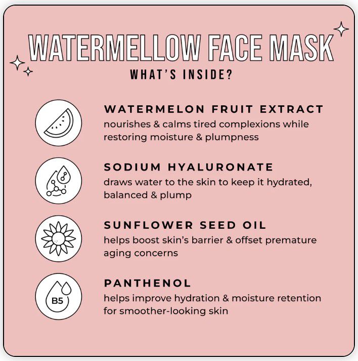 水 (Aqua)、雙丙甘醇、丁二醇、甘油、泛醇、海藻糖、甜菜鹼、羥基苯乙酮、向日葵籽油、丙烯酸酯/C10-30 烷基丙烯酸酯交聯聚合物、卡波姆、氫氧化鉀、西瓜果提取物、尿囊素、聚甘油-10 月桂酸酯、聚甘油-4月桂酸酯、乙基己基甘油、辛基/癸基葡糖苷、透明質酸鈉、1,2-己二醇